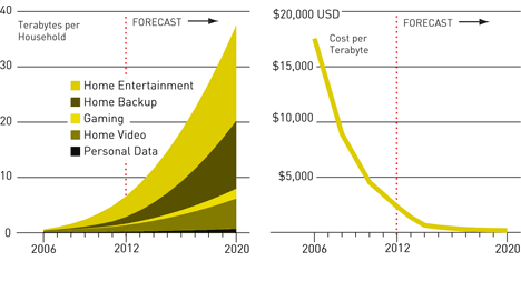A new study by Booz & Company reveals two concurrent trends changing the landscape of the communications industry. First, as shown below at left, residential consumers’ demand for cloud storage exceeds 6 terabytes (about 6,000 gigabytes) per household, and is expected to increase close to sixfold by 2020. But those consumers are still restricted by price. As the second trend (at right) shows, however, this will change: The price of cloud storage is dropping dramatically. Software and search companies like Google, e-retailers like Amazon, and media and telecommunications companies everywhere will be drawn into new types of competition to provide consumers with their piece of the cloud.