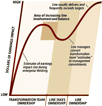But during implementation, we have also found that line managers often exceed their commitments. This basic pattern has been observed at many companies with successful change programs. However, the better result does not happen without a lot of focus and effort. When the erosion from an early estimate is initially observed, management must respond by increasing the attention and pressure on the line managers to deliver more.