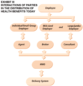 As the prevalence of health coverage grew, the employer's role evolved. In 1943, employer contributions for health benefits became a form of pre-tax compensation. This immediately pushed the employer into the purchase process as a group buyer. The employer often worked with agents, brokers and consultants in making large group purchase decisions. (See Exhibit III.) Unfortunately, this process placed as many as three layers between employees and their health-care delivery system.
