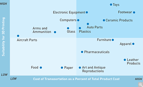 As 3D printing becomes more common, many products, their parts, or the raw materials needed in their manufacture can be made locally—reducing or eliminating the need to ship them to market. Footwear and toys, for example, are likely to require much less shipping in the future because they are currently both costly to transport and highly suitable for 3D printing.