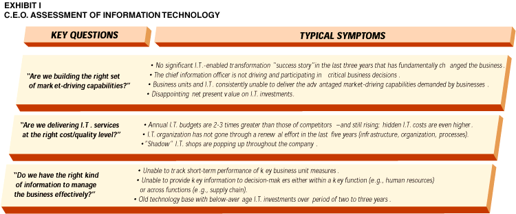 To meet these pressures, C.E.O.'s have shifted the items on their agendas. In our discussions with leading C.E.O.'s around the world, we have found that they are no longer emphasizing cutting costs; instead, they are committed to growing the business. As C.E.O.'s try to transition their corporations from a cost-restructuring mind-set to one of exploiting new growth opportunities, their focus tends to be on the familiar (e.g., market share gains, globalization, new product innovations, time-to-market, customer satisfaction). Information technology (I.T.) and its potential for building advantaged, market-driving capabilities are rarely, if ever, considered as a key part of the C.E.O. agenda.