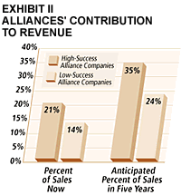 Success in alliances also translates into superior growth. The successful companies, on average, see alliances contributing more to current revenues. (See Exhibit II.) More importantly, the alliance capability positions them for faster growth over the next five years. The successful companies expect about 35 percent of their future revenues to come from alliances, up steeply from the current 21 percent and from 15 percent in 1995. Successful companies are also more than twice as likely to be engaged in strategic alliances rather than in the more modest transactional ones. Clearly, it is easy to see the linkage between the strategic nature of these alliances and the higher growth anticipated by the more successful companies.