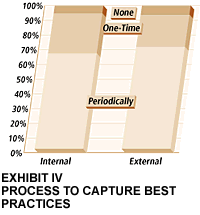 1) Best-Practice Capture. As we have seen, alliance profitability improves as a company gains experience with alliances -- experienced companies earn twice the return on investment as the alliances of inexperienced firms. This has inspired many companies to try to jump-start the alliance-learning curve by developing a set of best practices. More than 90 percent of the companies we surveyed recently have some sort of process in place to capture best practices. Moreover, about 60 percent of them attempt to periodically capture internal best practices; about 70 percent attempt to periodically capture external best practices in alliances. (See Exhibit IV.)
