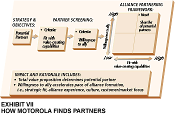 Motorola Inc. recognized early how alliances can play important roles in achieving its goals. After having been through a number of alliances, Motorola's management realized that having a disciplined process was the key to achieving alliance success. One part of the Motorola process involves the selection of strategic partners. (See Exhibit VII.) It starts with a clear alliance strategy and objectives, which are linked to the overall corporate or business strategic objectives. The next steps include partner criteria such as alliance experience and fit with value-creation capabilities, along with the willingness of a potential partner to ally. For first-time partners, Motorola offers an alliance-training seminar to provide information on Motorola's alliance requirements and process.