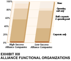 5) Organizational Solutions and Embedding. When we asked companies where the alliance functional resources reside, we found that almost every imaginable model seems to exist. About a third of the companies lodged the resources on the corporate level and about a quarter in the operating unit. The balance of companies mixed the resources through the corporate and operating-unit levels. (See Exhibit XIII.)