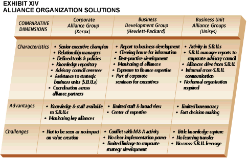 Other companies, including Unisys, have chosen to place alliance activity within each appropriate business unit. Such a structure yields fast decision-making and limited bureaucracy. The potential problems are limited knowledge capture, learning transfer and leverage across strategic business units. (See Exhibit XIV.)