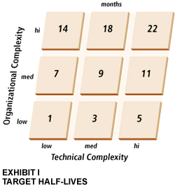 In 1988, I introduced the concept of the "half-life" associated with continuous process improvement.1 After benchmarking nearly 100 examples of exemplary use of the P.D.C.A. cycle (Plan-Do-Check-Act), I observed that for each process being improved, the rate of improvement was constant. The (constant) time it took for each 50 percent reduction in defect level (I called this the half-life) depended on the complexity of the process. I developed the matrix in Exhibit I, which summarizes these data.
