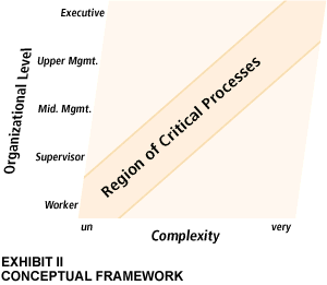Exhibit II is a graphical representation of this assertion. The x-axis is complexity, ranging from uncomplex to very complex. I have avoided the word "simple" since an uncomplex process may not appear to be simple to its owners. The y-axis is organizational level. It ranges from nonexempt workers to the entity leader or C.E.O. The diagonal band represents the region into which most processes tend to fall.