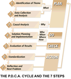 The seven-step method followed by the Q.C. circle is a special case of the P.D.C.A. Cycle (see Exhibit). The rigorous adherence to this problem-solving process avoids several common difficulties encountered by teams.