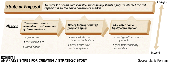 Another advantage of the analysis tree is its usefulness in helping managers develop flexibility in their storytelling. No single version of the strategic story fits all stakeholders. The tree can be expanded or contracted readily to suit the storyteller's assessment of which version is most appropriate for each constituency he wants to address. So, for example, a five-minute session with the chief executive officer might focus exclusively on top-level issues: health-care trends, potential Internet applications and the relative desirability of entering the home health-care market. A longer discussion with managers unfamiliar with health care might provide a detailed picture of trends in the health-care industry. A memo or talk to the research and development unit might focus on specific Internet applications for the market.