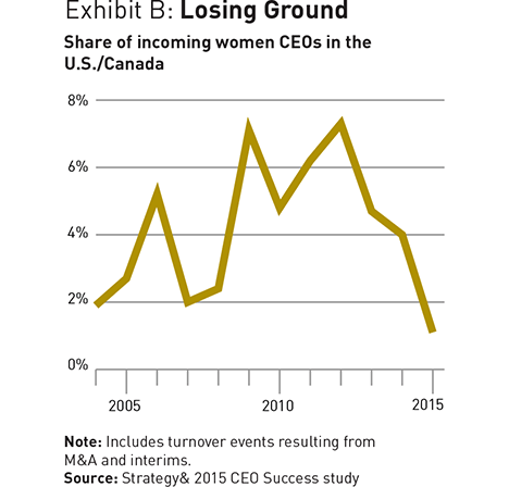 One of the least impressive results in 2015 was in North America, which has historically been the most welcoming of all regions for women executives. Since 2004, incoming women CEOs in the U.S. and Canada have made up 4 percent of the total, compared with the global average of 3 percent. In fact, 42 percent of all the women CEOs who have been appointed over the last 12 years were appointed at North American companies. But in the U.S. and Canada, only one woman CEO was appointed in 2015 to our sample set of the world’s 2,500 largest public companies — Andrea Greenberg, who became CEO of MSG Networks in the spin-off from Madison Square Garden. At 1.1 percent, this was the lowest percentage of incoming women CEOs in the U.S. and Canada since we began tracking the incoming class of CEOs in 2004 (see Exhibit B).