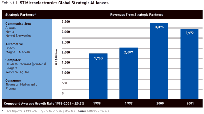 ST’s network of strategic alliances contributes more than revenues to the company. The alliances also have helped the company access and assimilate complex knowledge from disparate sources. For a chip company created far from the talent pool of Silicon Valley, this is a core competency and a major source of differentiation.