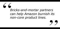 The deals can expand Amazon beyond its core BMV (books, music, and video) line into other consumer-products categories. For Amazon's strategy to work, it must find retail partners with products, demographics, and locations that fit with Amazon's strengths in technology, customer service, and logistics.