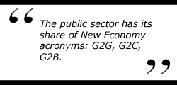 Think of public agencies, and such stereotypical images as long lines at offices and inattentive bureaucrats come to mind. Think again: Governments are using digital technologies to reinvent how they operate, complete with New Economy acronyms like G2G, G2C, and G2B. Opportunities to do things better and cheaper abound — they can be found wherever governments connect with citizens and businesses.