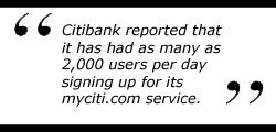 According to the new Booz-Allen & Hamilton and e-Rewards survey of 1,001 aggregation-service users and 1,900 general Internet users, the number of users of aggregation services exploded in 2000 from 10,000 in January to 700,000 in December. Citibank reported that it has had as many as 2,000 users per day signing up for its myciti.com service.