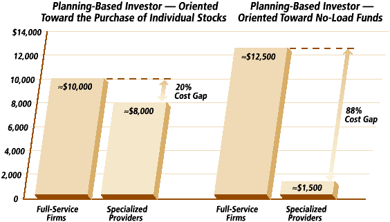 Investors who are less self-directed and more concerned with developing and executing an in-depth financial plan are more likely to realize value from a full-service provider. The costs of preparing a financial plan and obtaining asset allocation and investment selection advice on an "unbundled" basis quickly level the playing field between specialized and full-service providers if the customer invests largely in "load" mutual funds. (See Exhibit IV.) However, if that planning-based investor is oriented toward the purchase of individual stocks, the cost gap between specialized and full-service providers begins to reappear in the value equation. Even more ominous for full-service firms is the growth of the cost gap if the planning-oriented investor uses no-load mutual funds. (See Exhibit V.)