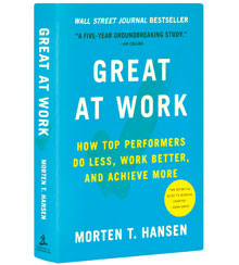 Great at Work: How Top Performers Do Less, Work Better, and Achieve More reports the findings of what Hansen bills as “one of the most comprehensive research projects ever undertaken on individual performance at work.” Hansen and colleagues conducted a five-year study of 5,000 managers and employees. Hypotheses were formulated and confirmed; behaviors were identified; links to high performance were established. This is all described in a 30-page research appendix presented in a suitably minuscule font — an unmistakable signal that it can be skipped.