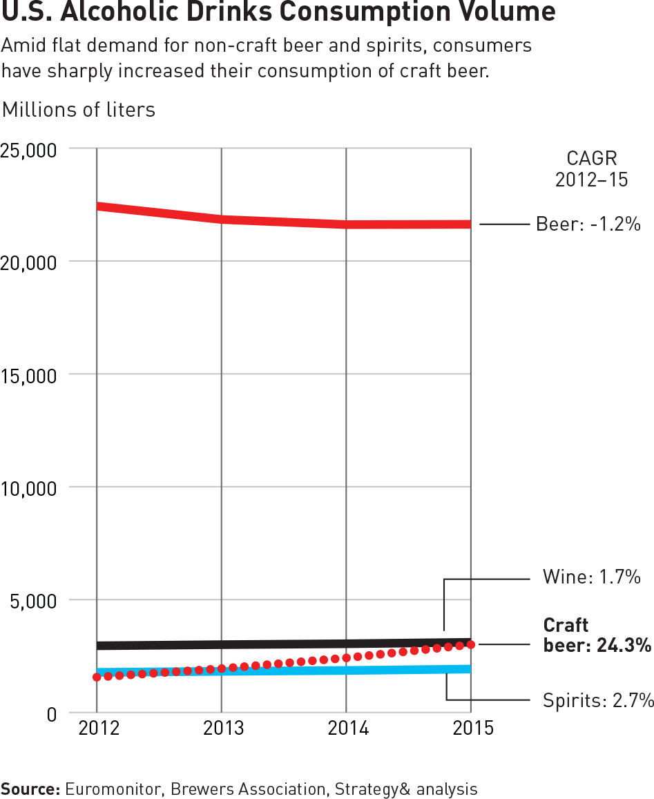 Between 2012 and 2015, volumes for U.S. alcoholic drinks grew at an anemic compound annual growth rate (CAGR) of 1.1 percent, and non-craft beer’s share of drinks consumed fell from 78 to 73 percent. But in these years, craft brewers’ share of drinks consumed doubled, from 5 percent to 10 percent — representing a 24.3 percent CAGR in volume (see “U.S. Alcoholic Drinks Consumption Volume”).