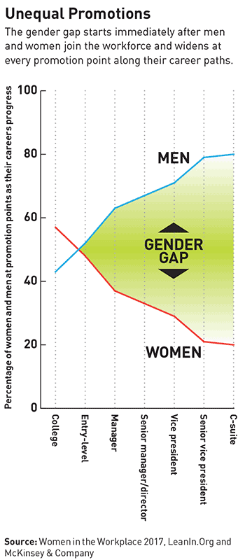 The under-promotion of women early in their careers massively impacts the pipeline of women available for middle and senior management positions, which significantly affects the gender gap at higher organizational levels (see “Unequal Promotions”). If women were promoted at a rate equal to that of their male peers, solely at the entry level, the number of women at the senior vice president level and C-suite level would more than double.
