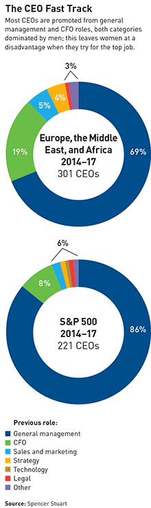 We analyzed the path to the corner office in S&P 500 companies from 2014 to 2017. The vast majority of CEOs were appointed from within (see “The CEO Fast Track”). Approximately 80 percent of CEO appointments were internal promotions (up from 59 percent in 2004). Of these appointments, the significant majority were promoted from the roles of chief operating officer or divisional president. Specifically, from 2014 through 2016, 86 percent of CEOs were appointed from these general management positions. The next most likely position from which CEOs were appointed was chief financial officer. In the United States, 8 percent of CEOs were appointed from the CFO ranks from 2014 through 2016. In Europe, over this time period, 69 percent of CEOs were appointed from general management and 19 percent from the CFO position.