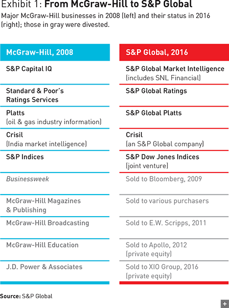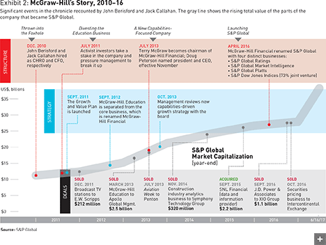 Because of their close working relationship, Berisford and Callahan would play critical roles in leading this successful transformation, overcoming what in many companies would have been a daunting obstacle: their status as relative outsiders. Each had recently been hired to fill vacated positions on the executive team, Berisford as CHRO and Callahan as CFO. As it happened, they had both previously worked at PepsiCo, though they hadn’t known each other there. Berisford joined McGraw-Hill directly from PepsiCo after 22 years; Callahan joined following a stint at Dean Foods after having spent a decade at PepsiCo. During the next six years, their partnership helped McGraw-Hill realize more than US$23 billion in value, as the company dramatically reduced costs, divested its education business, and relaunched itself as a growth-oriented operating company called S&P Global, with distinctive core capabilities in financial information and analytics. McGraw-Hill had been a diversified company held together by a perspective that accepted many kinds of information businesses under one roof. The new company had a much more focused value proposition: “essential intelligence to the capital and commodities markets” (see Exhibit 1).