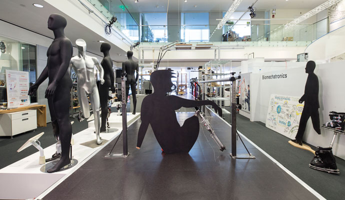 Across the hall from Herr’s glass-walled office is the vast third-floor lounge where Media Lab students pound away on laptops amid banners printed with MIT’s version of aspirational slogans, such as Seamlessly coupling the worlds of bits and atoms by giving dynamic physical form to digital information and computation. Course offerings advertised include the seminar Human 2.0, for which Herr delivers regular lectures. It’s not surprising that a discipline such as biomechatronics should be housed at the Media Lab, which has been at the frontier of human–machine research since its establishment in 1985.