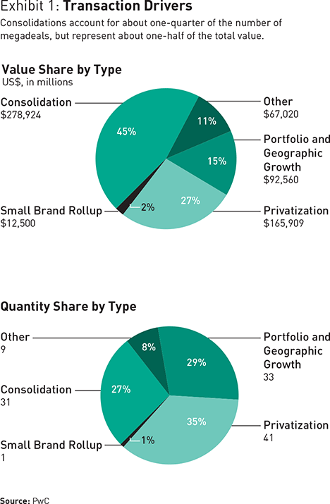 Given the trends, it’s not surprising that the overwhelming proportion of the supersized deals we have seen recently are being driven by transactions that can set the stage for aggressive cost reduction. Nine of the 10 highest-priced recent megadeals were one of two transaction types: consolidation or privatization. These two leading transactions accounted for three-fourths of all megadeal value (45 percent and 27 percent by deal value, respectively) during the sample period. Other transaction types, such as portfolio growth, geographic growth, and small brand rollup, were also part of the mix. But those types of deals typically came in at lower absolute values.