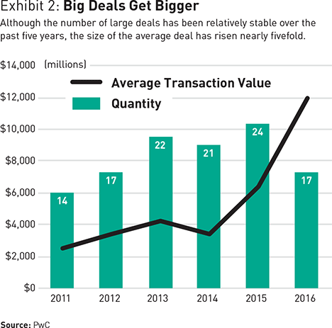 In the boardroom and on Wall Street, a new catchphrase is ringing out: Supersize me! This dramatic rise in deal value is rapidly reshaping the CPG landscape. In response to sluggish organic growth and activist investor pressure to enhance value, many of the biggest companies in the sector are scrambling to find ways of optimizing portfolios and cutting costs. A review by PwC of the 115 CPG megadeals (those valued at $3 billion or more) that took place between January 2011 and October 14, 2016, found that of the 20 biggest, 16 exceeded $10 billion; six exceeded $20 billion. Between January 2014 and October 2016, the average megadeal size more than tripled, from about $4 billion to more than $14 billion. This dramatic rise in deal value comes as the number of megadeals remains fairly constant year to year, as Exhibit 1 shows.