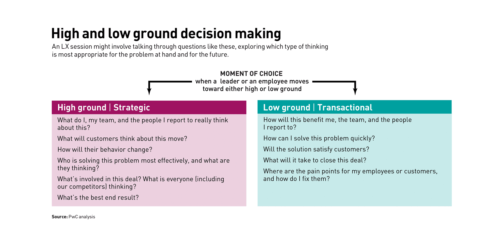 Our understanding of the interrelationship among LX, EX, and CX is still relatively new, but it derives from a number of well-established sources. These include PwC’s deep experience with organizational culture (developed by Jon Katzenbach and his associates at the firm’s Katzenbach Center), workforce transformation (developed through PwC’s “workforce of the future” initiative), digital upskilling (developed with the firm’s ongoing “New world. New skills.” program) and return on experience (pioneered in collaboration with the firm’s Experience Center and in work with the Katzenbach Center’s Reid Carpenter). We also draw on the work of such academic researchers as Carol Dweck, Linda Hill, and Nitin Nohria; on the examples of some pioneering companies such as the Danaher Corporation; and on the neuroscience-based “high ground” concept of strategic leadership.