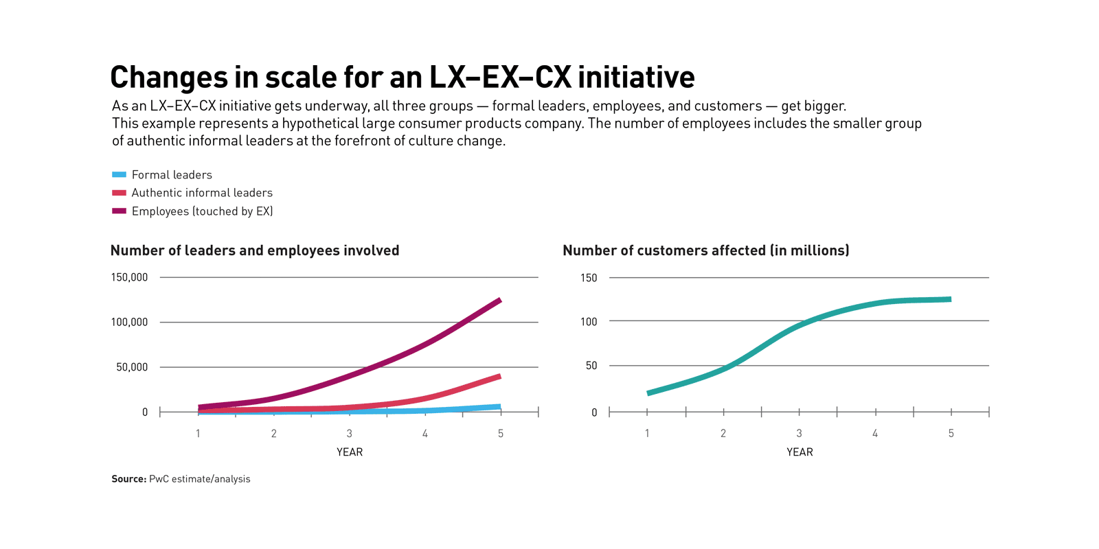 Start with the number of people involved. In a typical large corporation, a CX initiative might touch millions of consumers, whereas EX affects thousands of employees, and LX reaches a few hundred of the most senior leaders. Leaders, employees, and customers operate at different scales, but they affect one another dramatically. The high ground approach recognizes this by establishing routines by which each of them can increase their numbers, and thus they can gain in scale together (see “Changes in scale for an LX–EX–CX initiative”).
