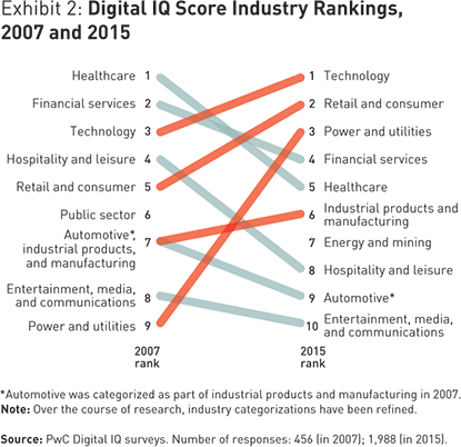 The results are evident in the Digital IQ rankings of industries (see Exhibit 2). In 2007, the gap between the most effective digital industry (healthcare) and the least (power and utilities) was 20 percent. Since then, performance has improved across the board, with only a 5 percent margin separating today’s highest-ranked industry (technology) from its lowest-ranked (entertainment, media, and communications). Technological transformations are taking place in every sector. In healthcare, hospitals have broadly adopted electronic health records in the name of enhanced patient quality; industrial companies have made major investments in comprehensive Internet of Things–style platforms that can improve the way wind turbines, jet engines, and other large-scale machines are used.