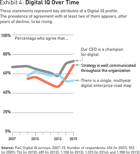 This improvement correlates with an overall rise in digital confidence, albeit with some industries excepted. Since 2013, we have asked respondents to rate the strength of their organization’s digital acumen. In 2015, two-thirds of them said they had a strong or very strong Digital IQ. This percentage had risen about 2 percent during each of the previous two years. The fact that a majority are paying attention, and that they are generally increasing their effectiveness, is welcome news (see Exhibit 3).