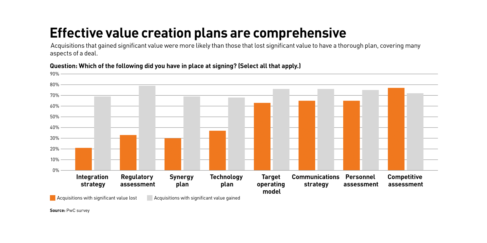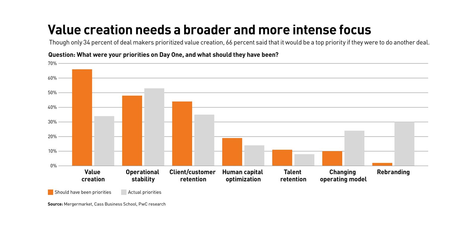 Our research showed that although virtually every company develops a value creation plan, only 34 percent said value creation was a top priority on the day they closed their most recent transaction.