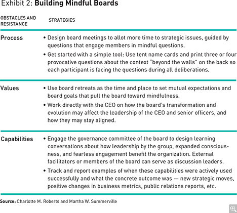 The evolution to a mindful board is not easy or natural. Three of the greatest obstacles and sources of resistance to greater mindfulness are presented by process (concerns and complaints that the new way of operating takes too long), values (deeply held beliefs about the board–CEO relationship and the nature of leadership), and capabilities (the degree to which members can engage in leadership by the group, expanded consciousness, and fearless engagement). Indeed, resistance will be such that some board members will no longer fit the new board culture and will need to be replaced. New members can expand the board’s capabilities, while seasoned members provide continuity and stability during the transformation to a mindful board.