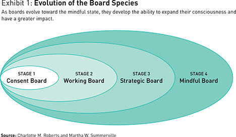 Through our experiences as board members, board leaders, and consultants, we have uncovered a developmental path that boards can choose to move along as their internal and external contexts change (see Exhibit 1). That path consists of four stages, of which the first three are relatively common and the fourth, which represents the next wave, is rare. Mindful boards, compared with other boards, are highly capable of meeting the increasingly complex governance challenges faced by companies.