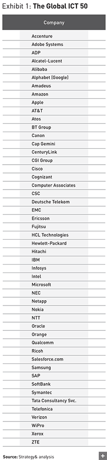Each year, Strategy&, PwC’s strategy consulting business, compiles a list of the 50 largest publicly traded companies in the ICT sector, ranked by a formula combining four measures: financial performance, portfolio strength, geographic footprint, and innovation and branding. Together, these criteria determine the degree to which these companies influence the enterprise market for digitization-related products and services. The most recent study, compiled with 2015 data, provides a clear picture of the most powerful companies in this industry, especially for B2B hardware, software, and services (see Exhibit 1). Several noteworthy findings: