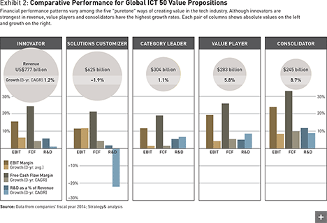 Although all the value propositions can be viable, an analysis of financial results during a three-year period (2012–15) demonstrates the superiority of innovation as a path to success in the ICT industry (see Exhibit 2). Companies with an innovator value proposition have captured the largest share of the overall ICT market, even though their growth rates have slowed over the past three years. For example, Apple, Google, and Samsung have all seen their growth slow, but continue to lead their industries in market share.