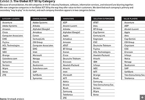 1. Category leaders. These companies focus on building a dominant position in a relatively narrow product or service category. They use that position to shape and influence the supply markets and sales and delivery channels in that category. A key indicator of this strategy is the positioning of a company’s products and services. We used assessments of market categories from the industry research firms Gartner Group (its “Magic Quadrant”) and Forrester Research (its “WAVE” analysis) to determine that 17 companies among the Global ICT 50 are category leaders. (We assigned each company in the list both a primary and secondary alignment according to their way of doing business. Our tallies here reflect these dual assignments. See Exhibit 3.)