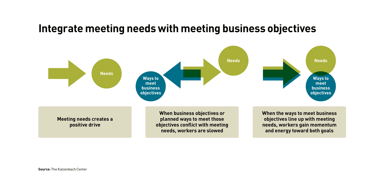 Meeting and engaging with needs produces a happier workforce and often incidentally improves performance. The consulting manager who engaged in energy audits improved her client reviews even as her teams put in less work and less face time. But if companies can line up their own objectives with meeting employee needs, they not only unlock positive feelings broadly but attach the force of this emotional energy to their specific goals (see “Integrate meeting needs with meeting business objectives”).