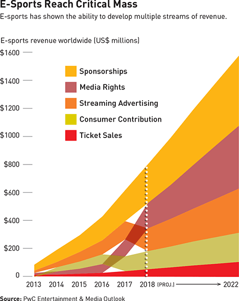 The rapid growth and high level of engagement are translating into real money. According to the PwC Global Entertainment & Media Outlook 2018–2022, a comprehensive source of advertising and consumer spending data available on June 6, 2018, total e-sports revenues across 20 countries — comprising sponsorships, media rights, streaming advertising, the consumer contribution to prize pots, and ticket sales — was estimated at $620 million in 2017, up 43.7 percent from $432 million in 2016. That total is forecast to reach $1.6 billion in 2022, rising at a 20.6 percent compound annual growth rate (see “E-Sports Reach Critical Mass”). Newzoo, an Amsterdam-based market research firm, estimates that the worldwide e-sports viewing audience grew in 2017 to 385 million, up nearly 20 percent from 326 million in 2016, and has a projected fan base of nearly 900 million by 2020.
