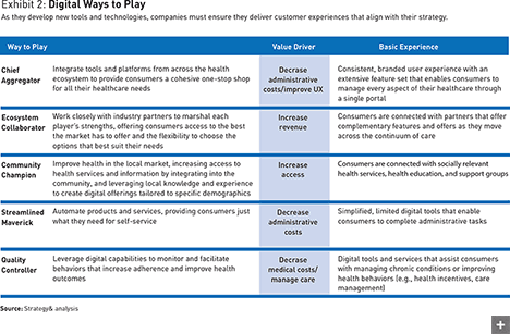 Of course, not every payor has the luxury of starting with a clean slate. Established insurers need to figure out how to deliver on existing promises while creating customer experiences that are unique to their brand and aligned with their strategic outlook. In other words, the path insurers choose going forward should depend in part on the path they’re already on. We’ve created a framework that helps insurers develop the right capabilities and decide where to invest on the basis of who they identify as their core customers, and the value they want to deliver (see Exhibit 2). Each of the five ways to play we’ve identified is based on a payor’s strategic imperatives and existing capabilities, and results in a different consumer experience.