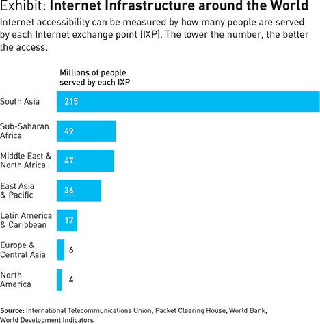 Modernization also means building more data centers and Internet exchange points (IXPs) in developing countries. This would provide the critical infrastructure that knits together national and international networks, and that makes connections faster and cheaper. At present, the more populous developing world has just a fraction of the international infrastructure of the developed north. In North America, for example, each IXP serves just 4.1 million people. By contrast, in South Asia, each IXP must handle 215 million (see exhibit). If the number of IXPs in developing countries rose, access to information, employment opportunities, and economic growth would also rise.