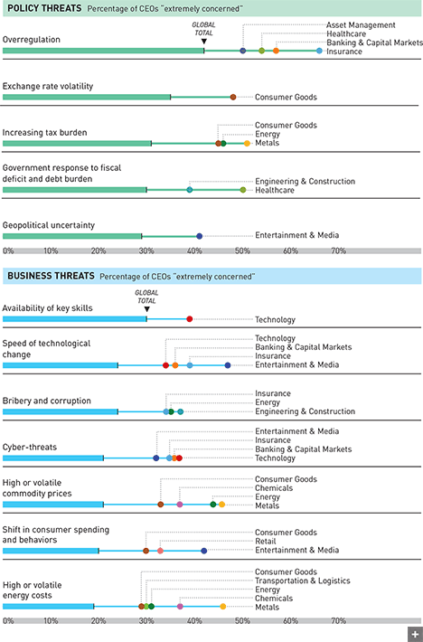 In a survey of 1,409 chief executives around the world, policy threats weigh heavily: 42 percent express significant worry about over-regulation. The top business concern among respondents is the availability of skilled labor; here, tech CEOs are the most anxious.