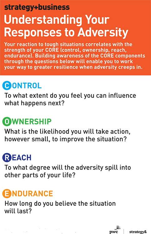 There are a variety of frameworks to help you understand the nature of adversity and your response to it. Among the more compelling models is Adversity Quotient, which is backed by decades of research. Developed by Paul G. Stoltz, Ph.D., this model measures your resilience according to the strength of your CORE (control, ownership, reach, endurance).