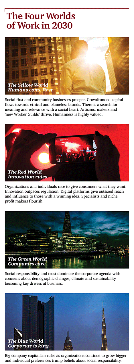On the one hand, “big company” capitalism could intensify as technology enables even larger organizations, or innovation could spur niche marketers to become more powerful, as in the blue and red worlds. On the other hand, there’s the possibility that collectivism will take priority as societies and companies work together through a sense of shared responsibility, as in the yellow and green worlds.