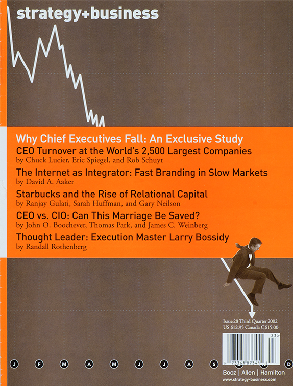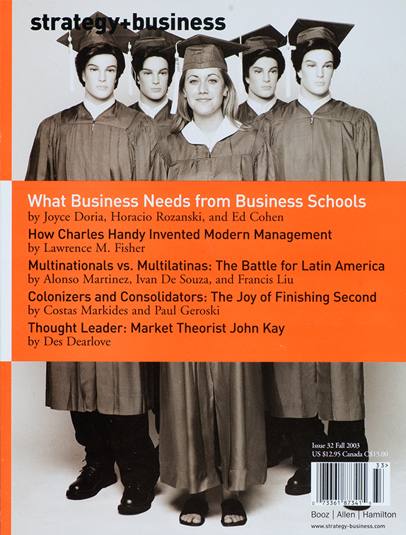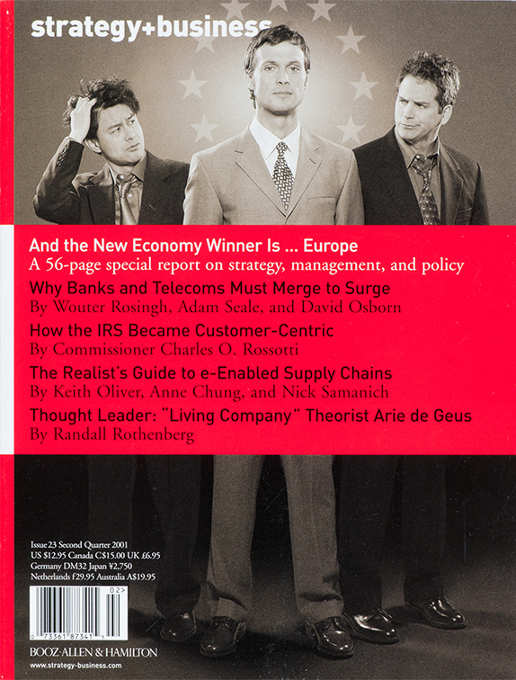 This photograph is by frequent strategy+business artist Matthew Septimus, and it’s a standout from this era of the magazine’s design evolution. The beaming smile of the central model (the daughter of then deputy editor Ann Graham) stands in direct contrast to the choir of lifeless figures behind her and captures perfectly the individual attention needed in business schools, as described in the related article.