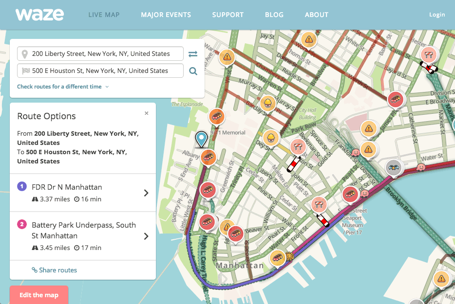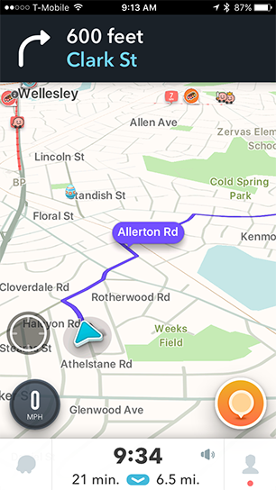 The Waze navigation interface, for all the complexity of its terrain, makes it easy to spot where you are now (the blue arrow), where you’re going (the purple line), and what you’ll find along the way.