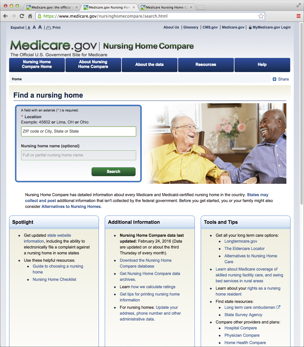The images of happy people benefiting from the services described here provide an emotional boost, and direct the visitor’s gaze left to the most critical element for a nursing home search: location.