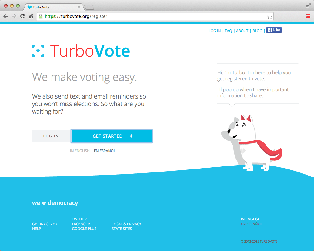 This voter registration and reminder site created by Democracy Works was instigated by a graduate student in public policy who kept missing elections. It puts the most-needed essentials at the center, including a call to action (“So what are you waiting for?” and a prominent “Get started” button). Lower-priority options and information are placed around the periphery.